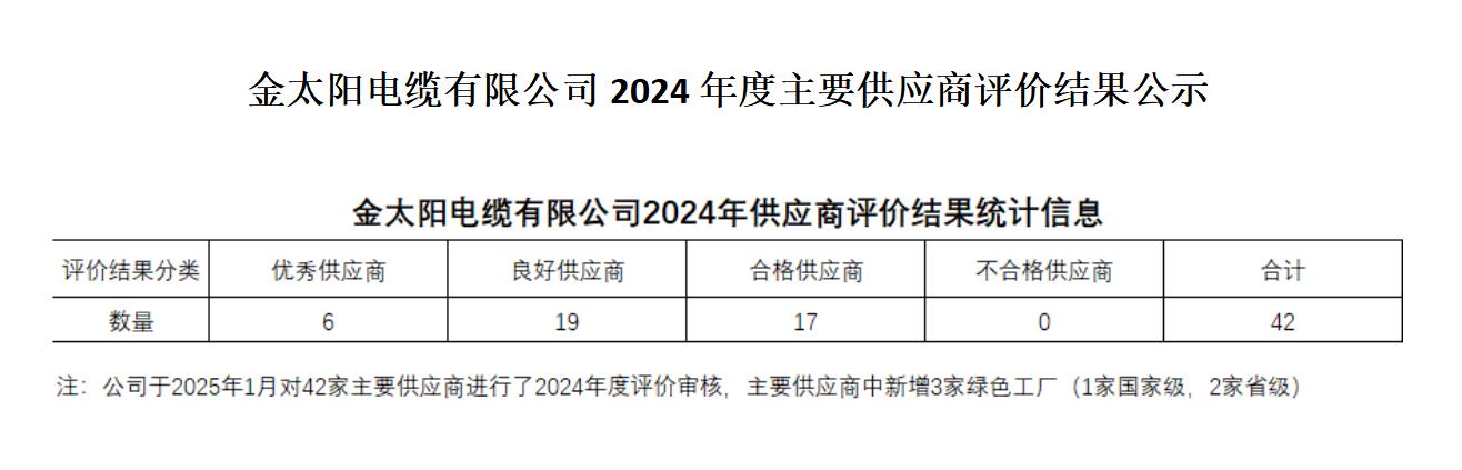 金太阳电缆有限公司2024年度主要供应商评价结果公示