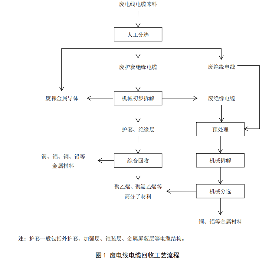 本标准明确了废电线电缆的回收工艺流程,主要包括人工分选、机械初步拆解、预处理、机械拆解、机械分选、综合回收等工艺环节,具体如图1所示。